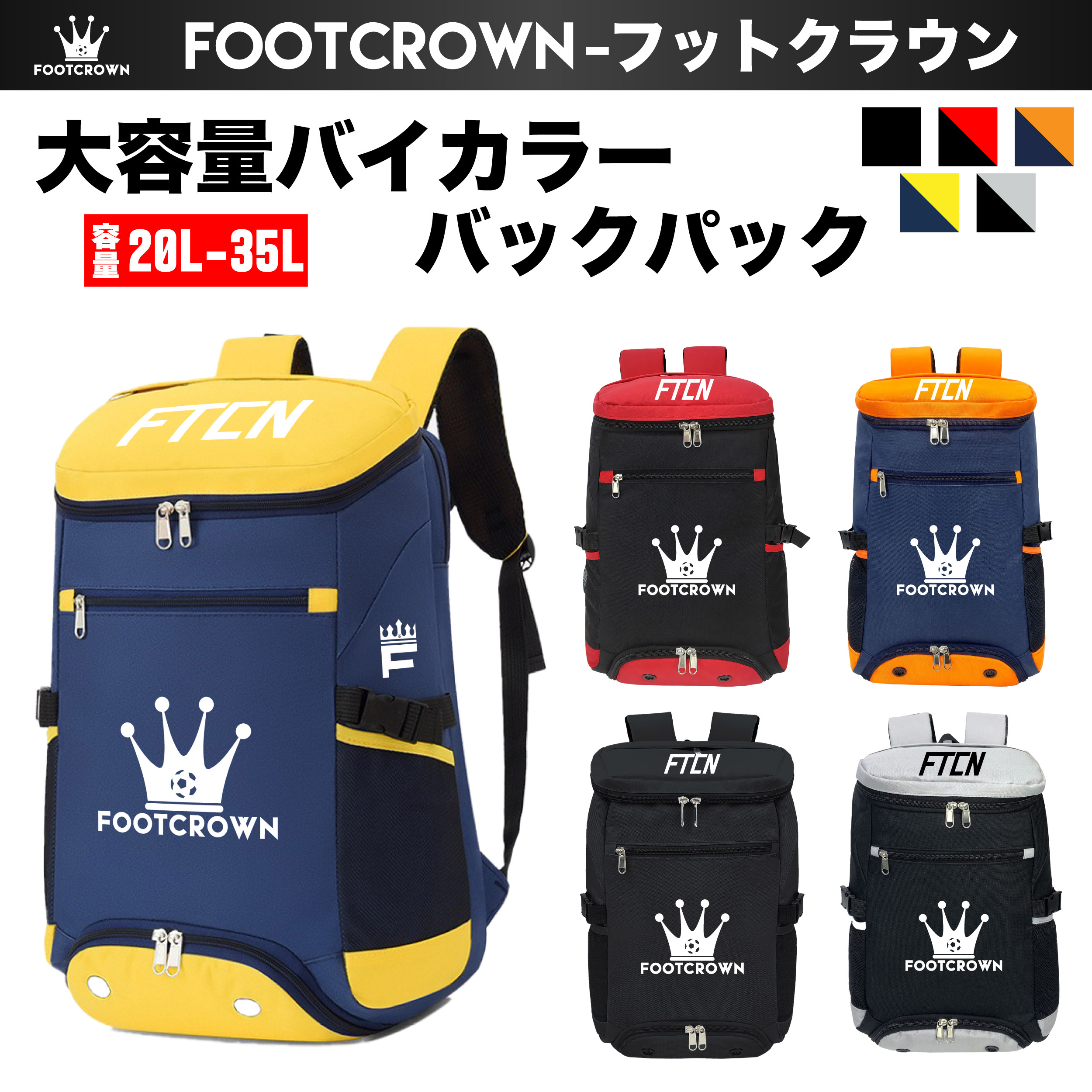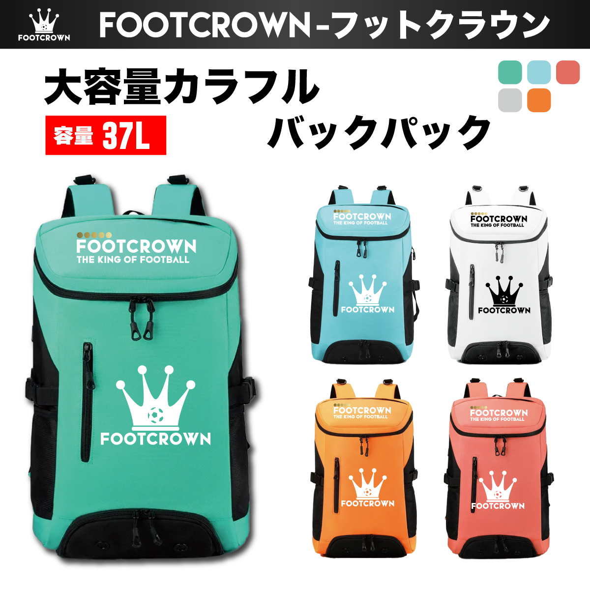 用途や体格に合わせて最適な容量(リットル)を選ぶことが大切です。 フットクラウンでは、ジュニアや普段使いに最適な19L~25Lから、遠征や合宿にも対応できる30L以上の大容量モデルまで幅広く展開しています。 チーム内でサイズを使い分けることも可能です。